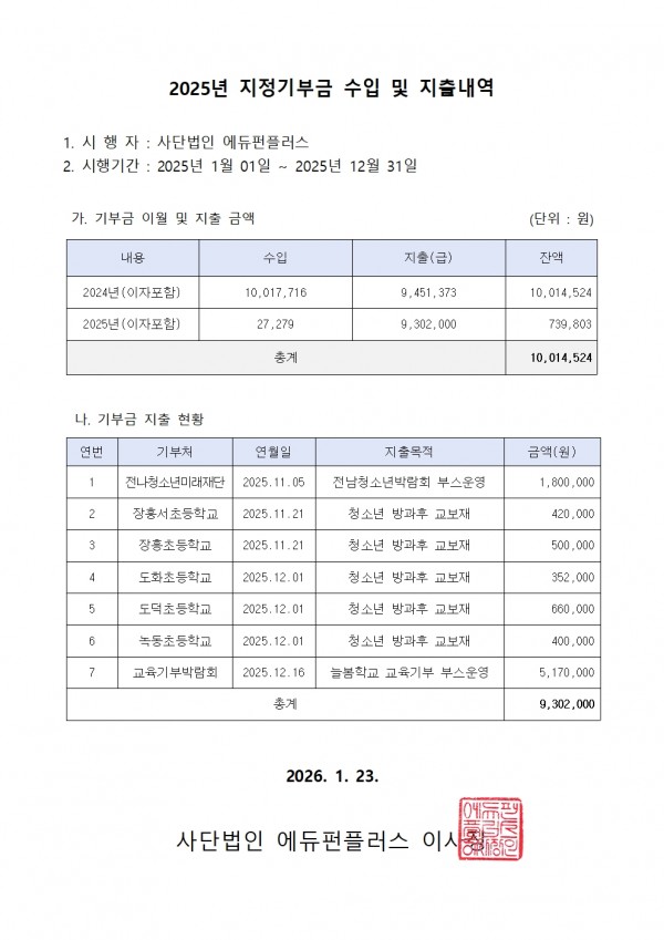 사단법인 에듀펀플러스 주소 : 전남 순천시 선암 1길5(덕월동778-5) 사업자등록번호 : 416-82-20075